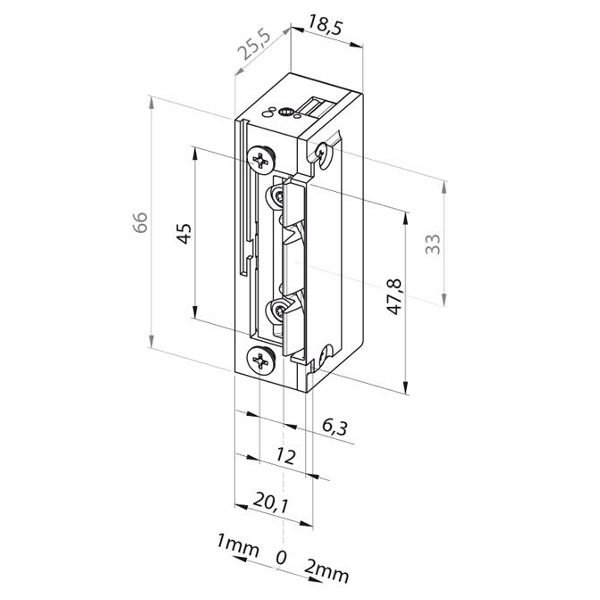 Najmniejszy wąski elektrozaczep o wymiarach 66x20,1x25,5 mm